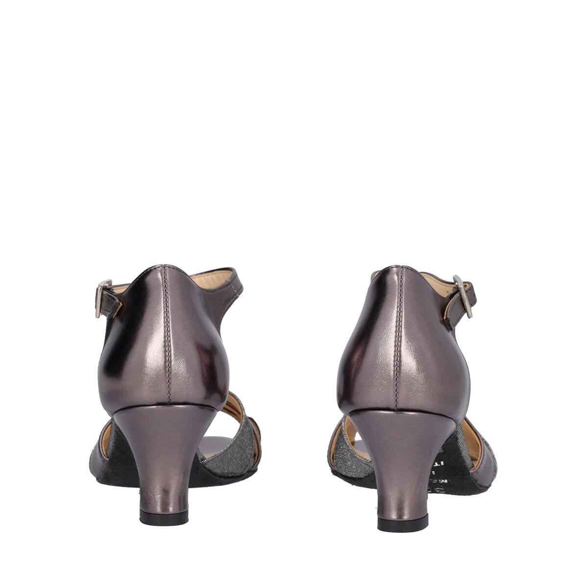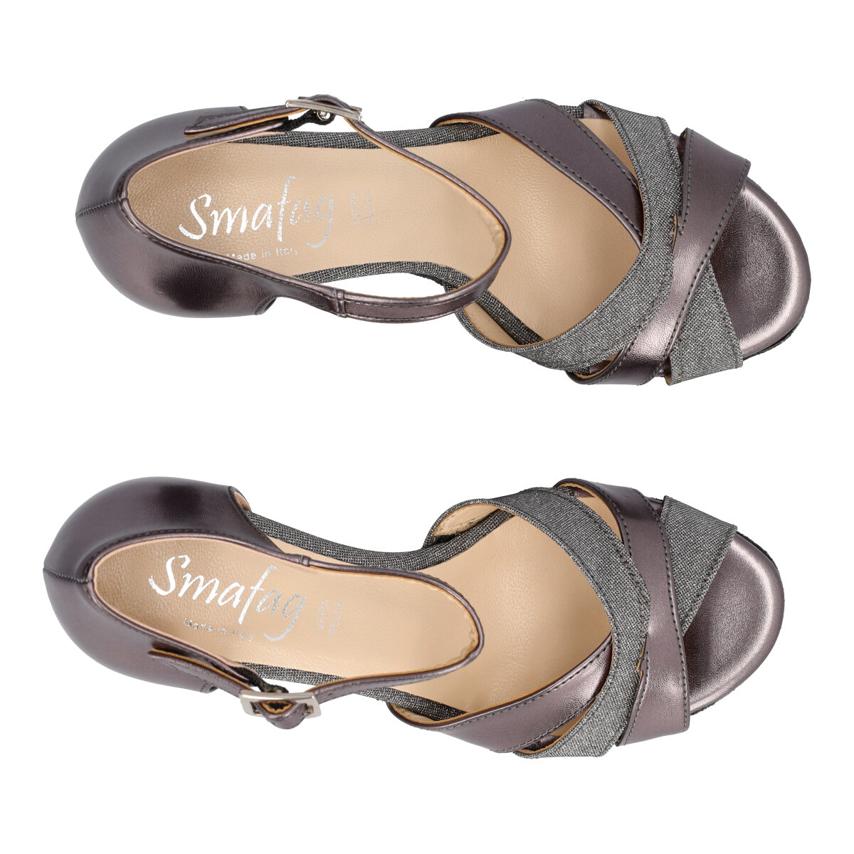 Sandalo da donna in tessuto glitterato con fibbia regolabile alla caviglia. Sottopiede in pelle e suola in vero bufalo. Prodotto Made in Italy. Altezza tacco: 6 cm