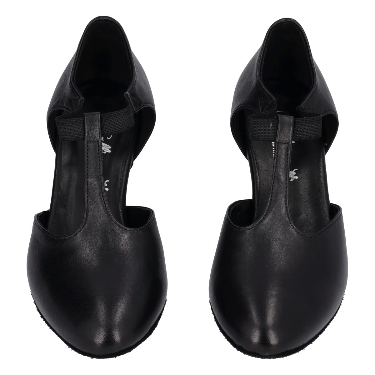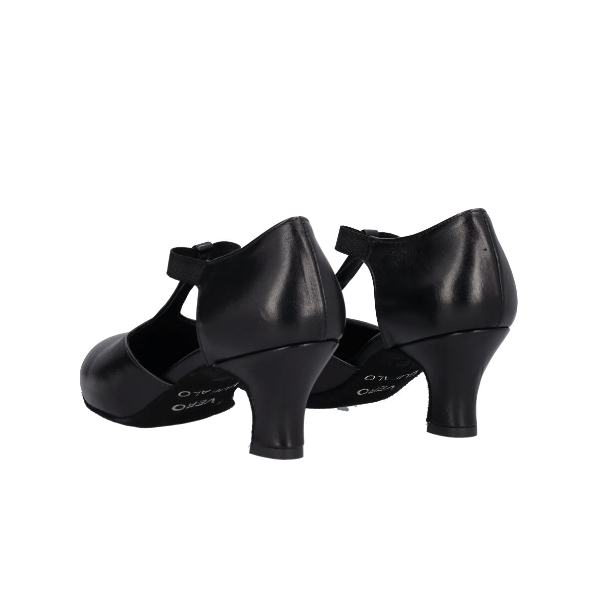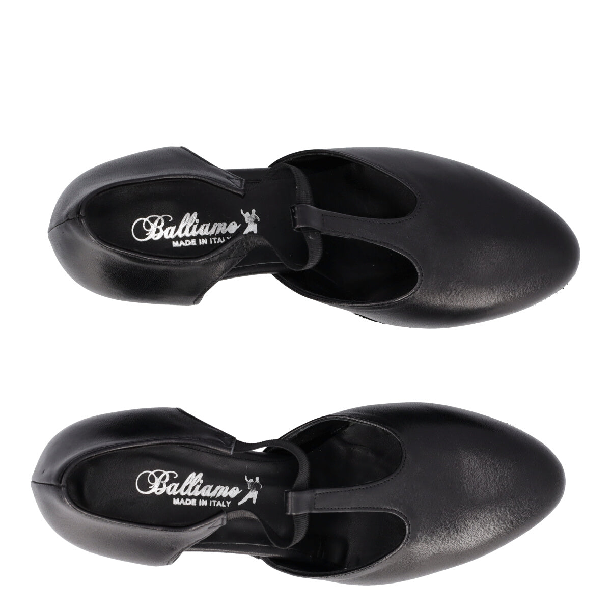 Sandalo da ballo da donna in pelle e cinturino a T con elastico. Sottopiede in pelle e suola in vero bufalo. Prodotto Made in Italy. Altezza tacco: 6.5 cm