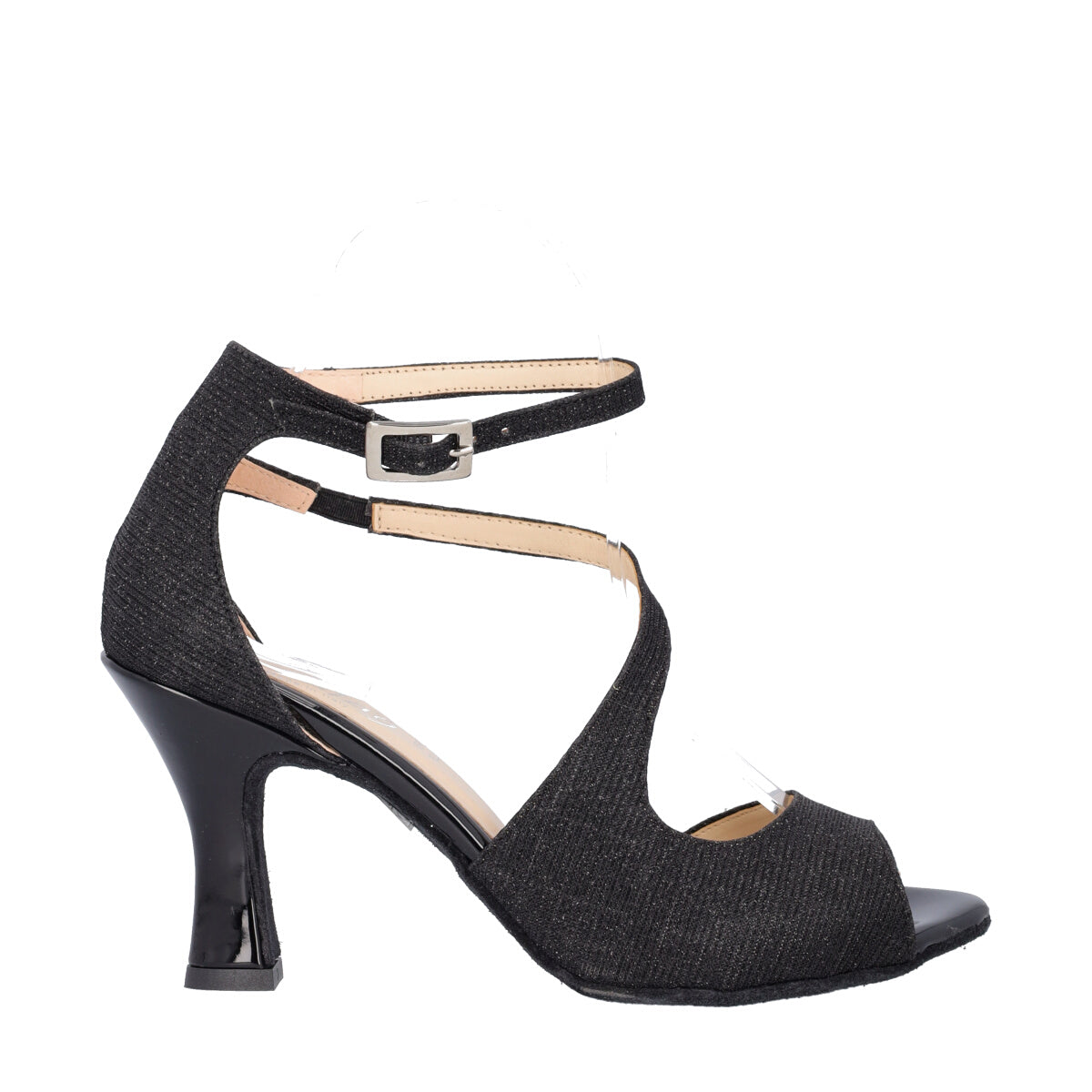 Scarpa da ballo aperta da donna in materiale effetto laminato con cinturino incrociato e fibbia regolabile alla caviglia. Sottopiede in pelle e suola in vero bufalo. Prodotto Made in Italy. Altezza tacco: 8 cm