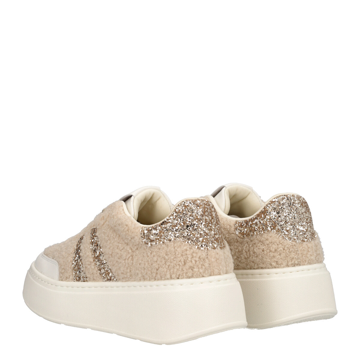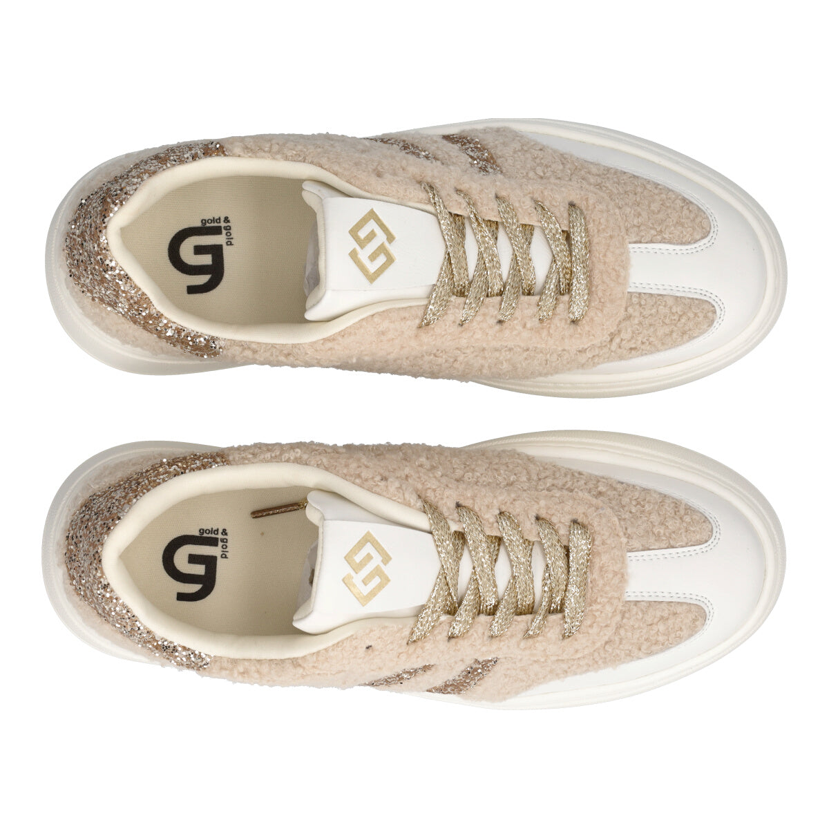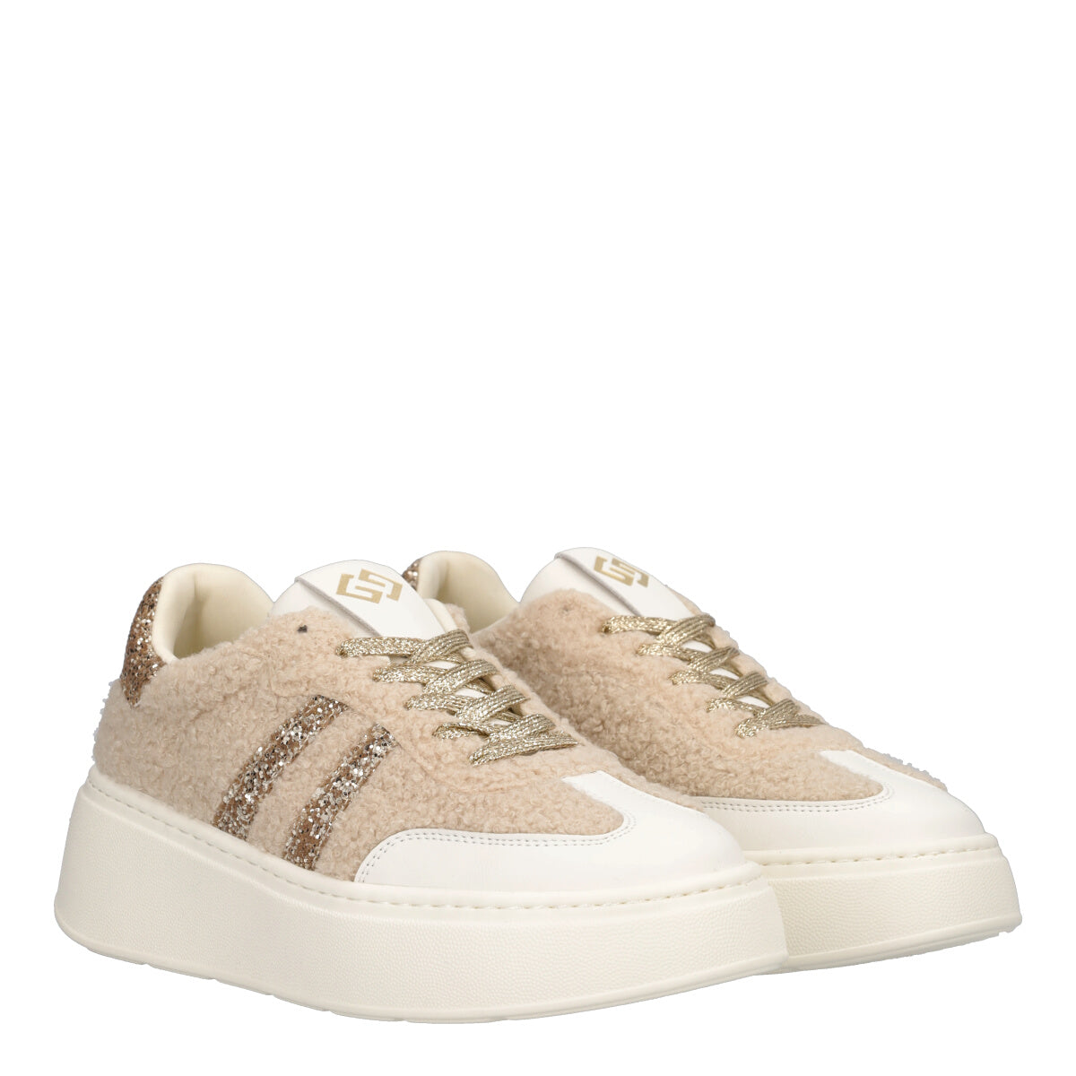 Le sneakers Gold&Gold con platform da 4.5 cm offrono un mix perfetto di comfort e originalità. La tomaia in tessuto effetto pecora dona un aspetto soffice e trendy, mentre il dettaglio di strass sulla parte posteriore aggiunge un tocco glamour. L'interno in tessuto assicura una calzata confortevole, rendendole ideali per un uso prolungato. Il platform di 4.5 cm non solo aggiunge altezza, ma fornisce anche un supporto stabile, rendendo queste sneakers una scelta chic e funzionale per ogni occasione.