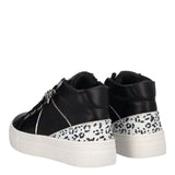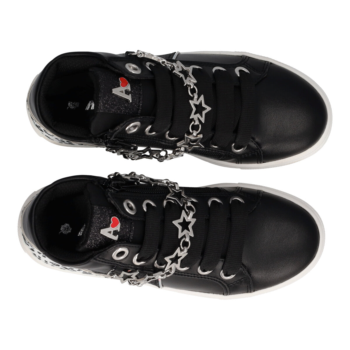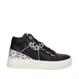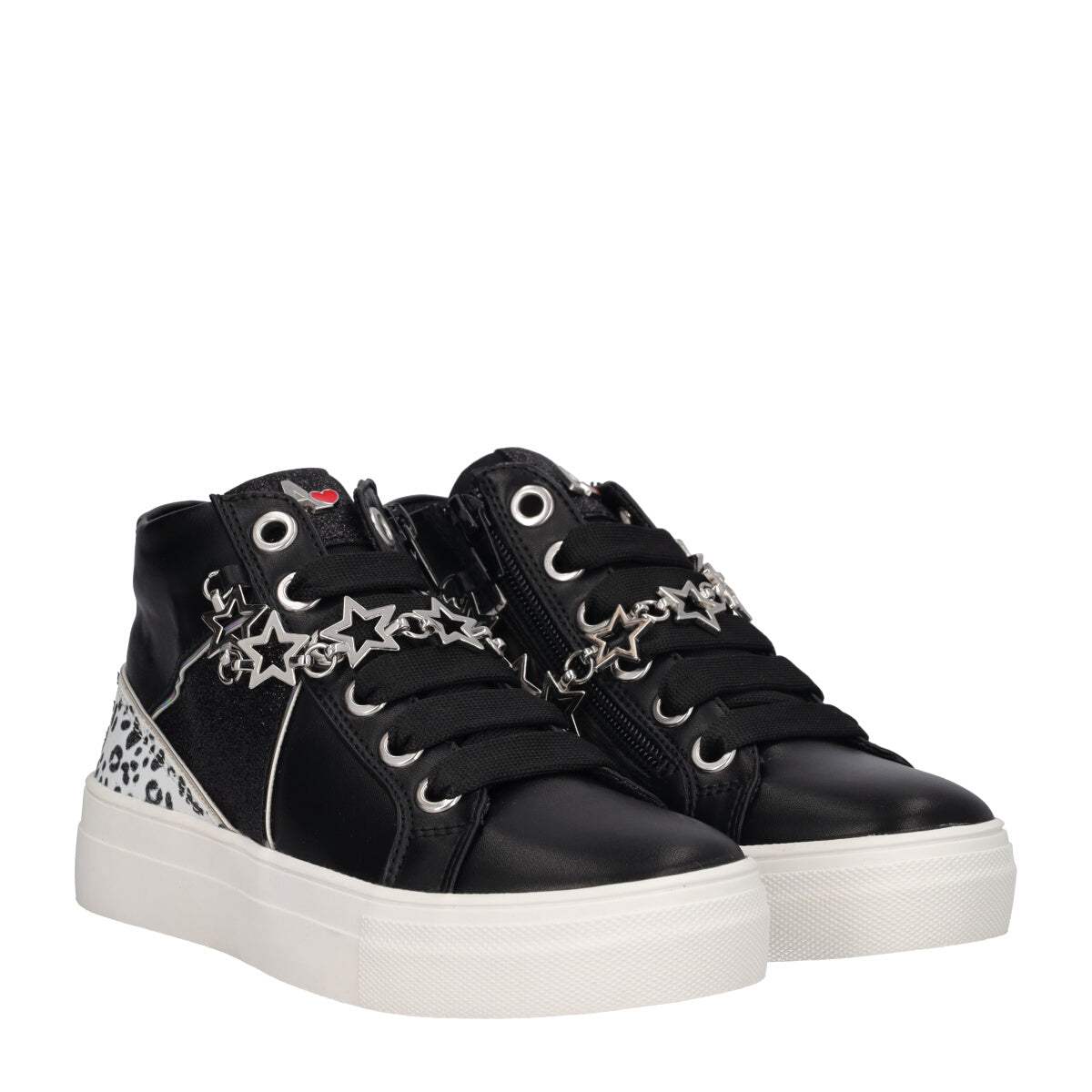 Sneakers modello alto da bambina firmate Laura Biagiotti, dotate di una pratica zip laterale e arricchite da una catena frontale con forme di stelle, che può trasformarsi in un elegante bracciale. Gli inserti leopardati glitterati aggiungono un tocco selvaggio e brillante al design. La suola in gomma garantisce comfort e aderenza, rendendo queste sneakers perfette per un look trendy e versatile.