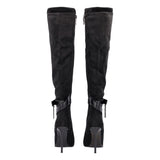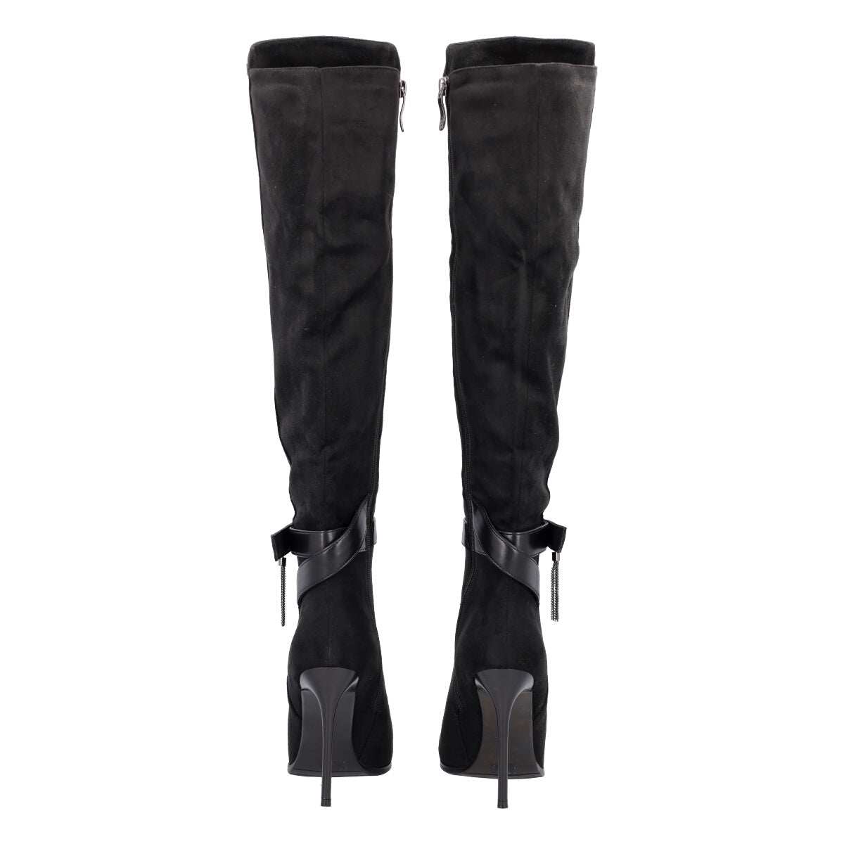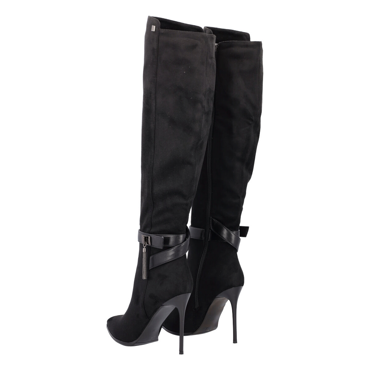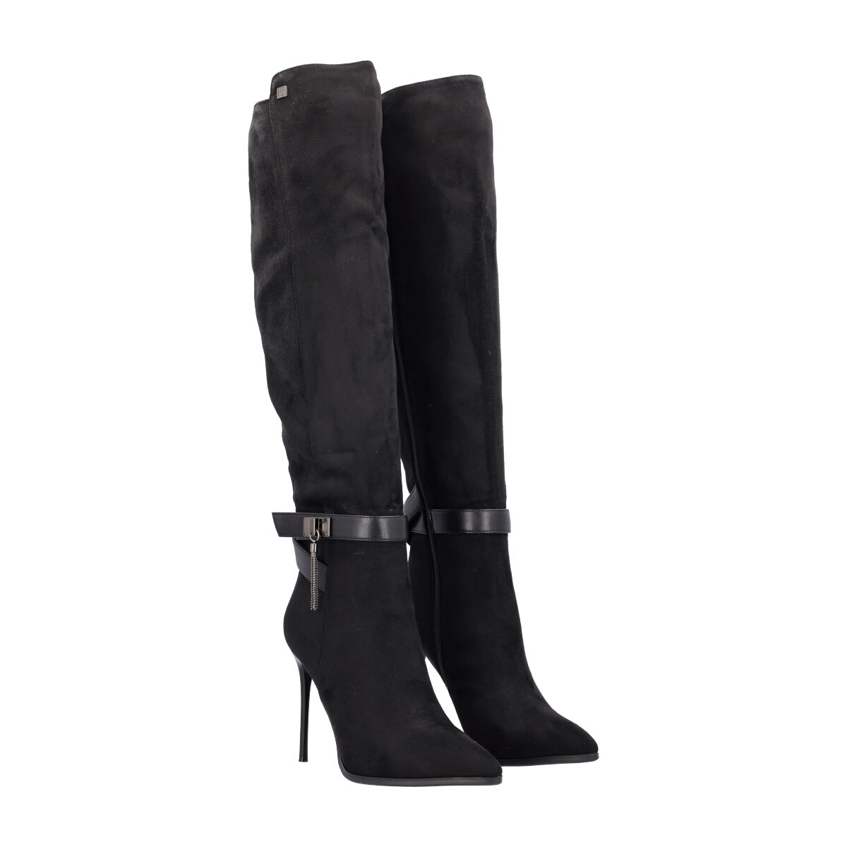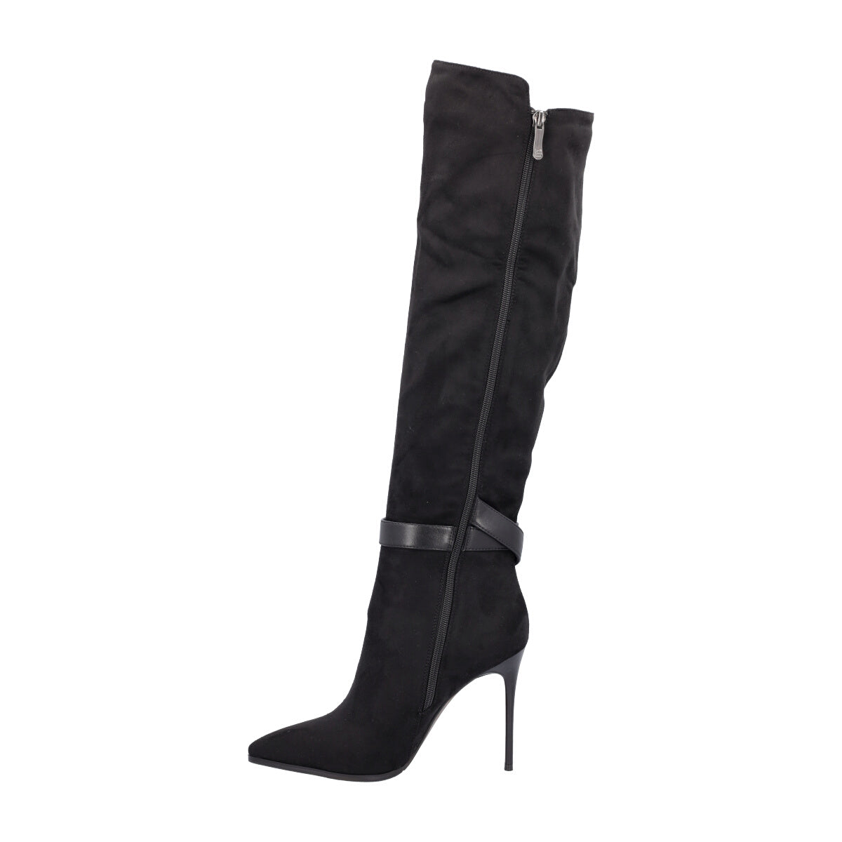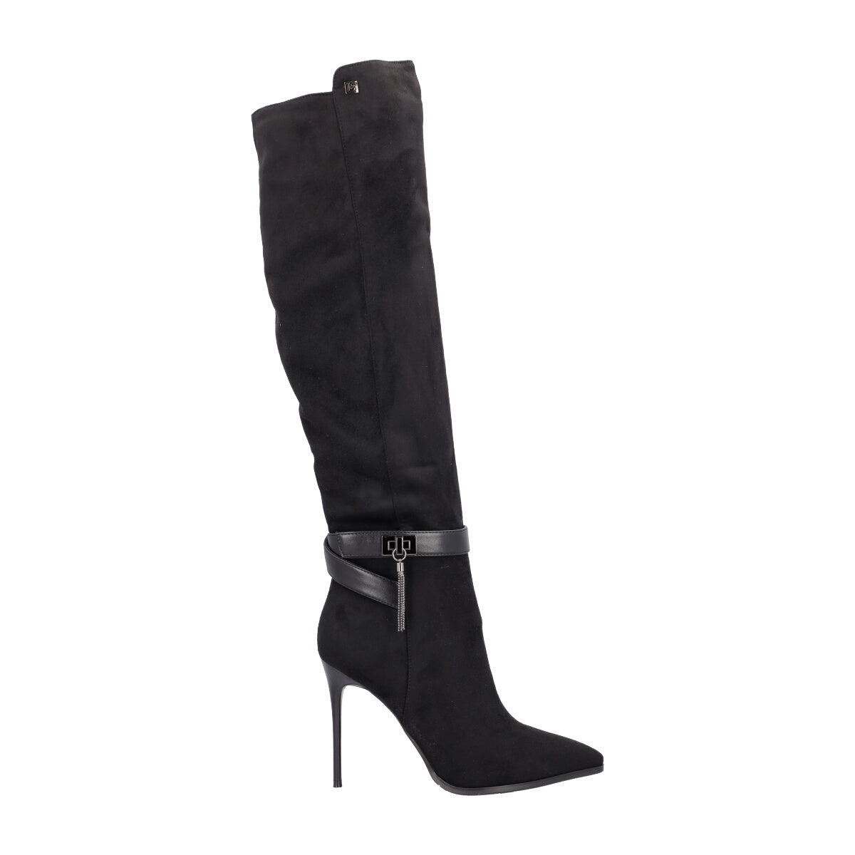 Stivale alto da donna a punta in tessuto scamosciato con tacco a spillo effetto vernice e cinturino decorativo alla caviglia con ciondolo metallico. La cerniera laterale facilita la calzata. Logo LB sul lato esterno e fodera interna in tessuto caldo effetto pelliccia. Suola sintetica. Altezza suola: 10,5 cm Altezza gambale: 43,5 cm Circonferenza gambale: 36 cm