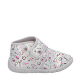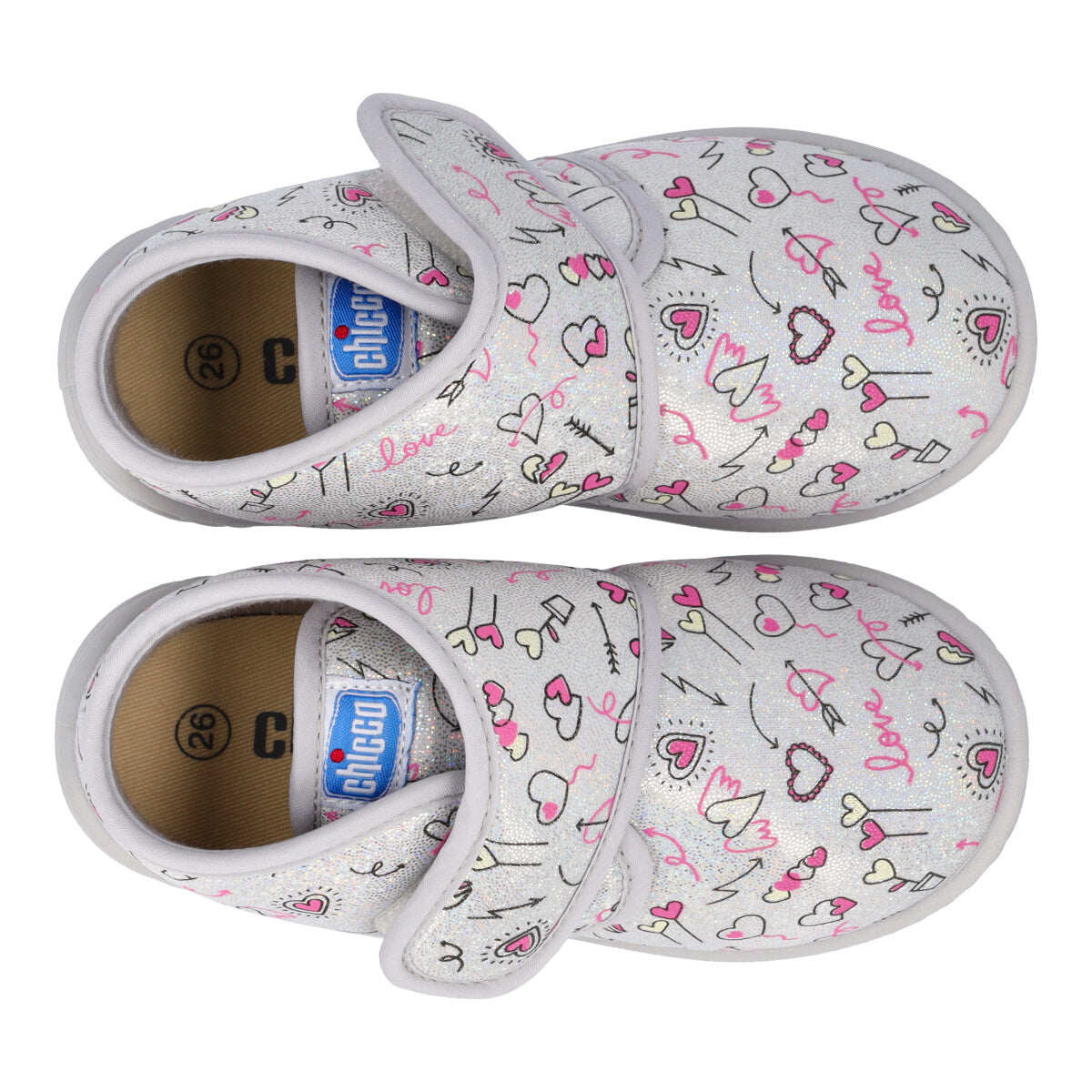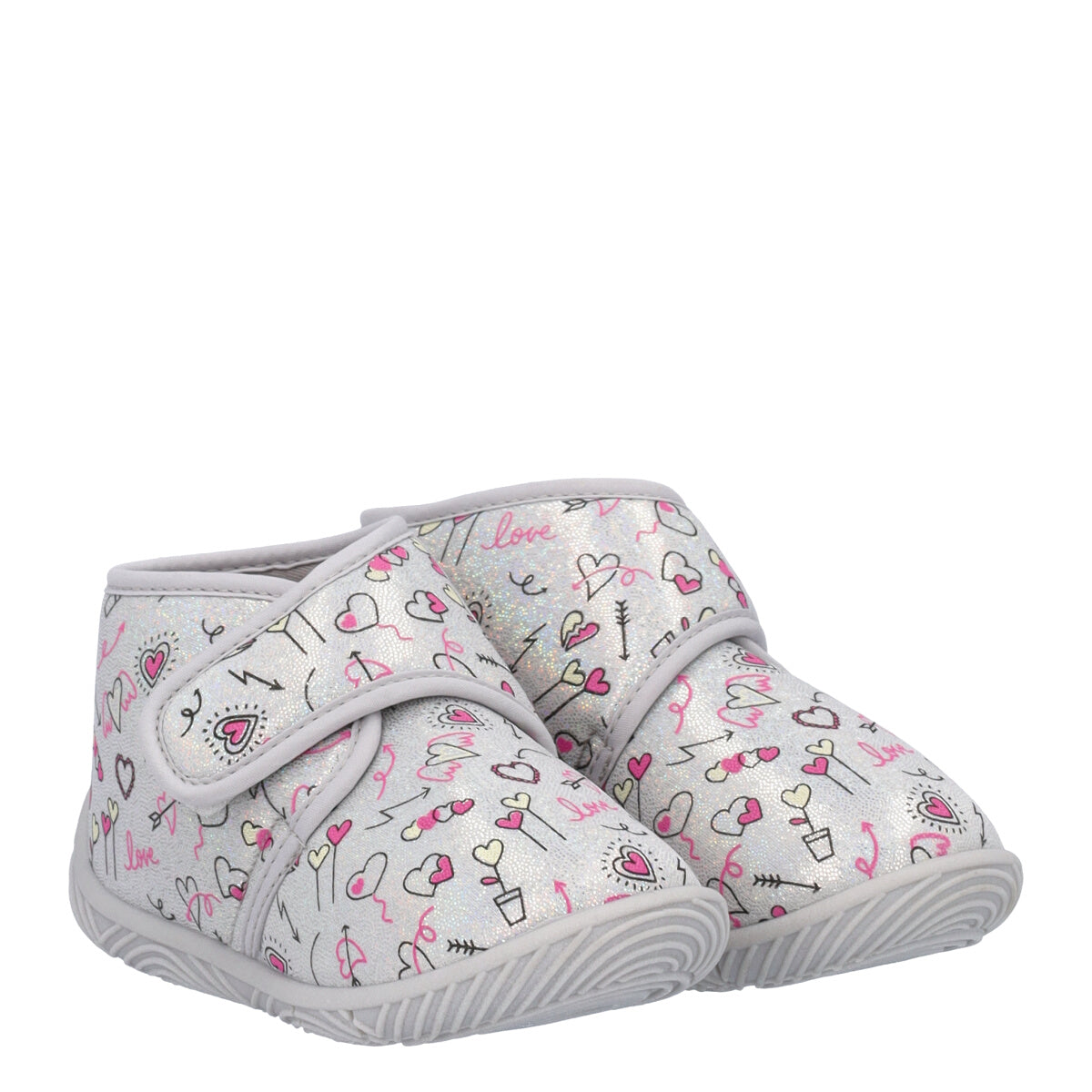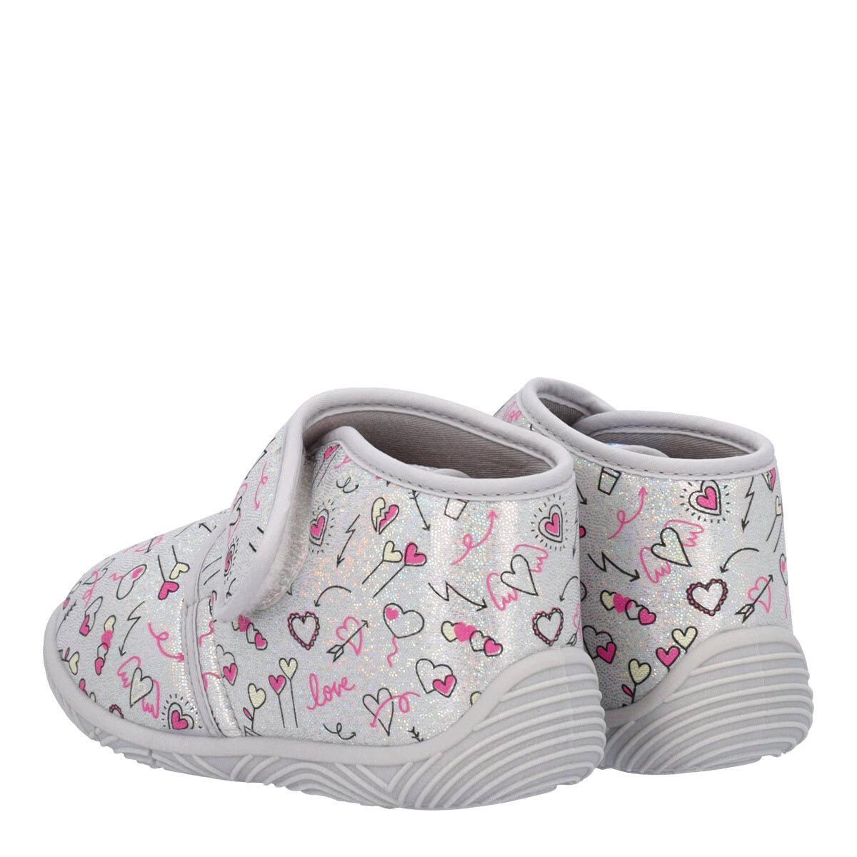 Pantofola grigia da bambina in tessuto glitter stampato con chiusura a strappo regolabile e fodera interna in cotone.