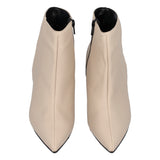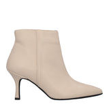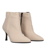 Stivaletto a punta da donna in similpelle con elegante tacco a rocchetto e zip laterale per facilitare la calzata. Sottopiede rivestito in vera pelle e suola sintetica. Prodotto Made in Italy.