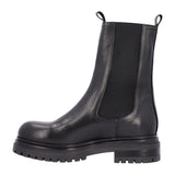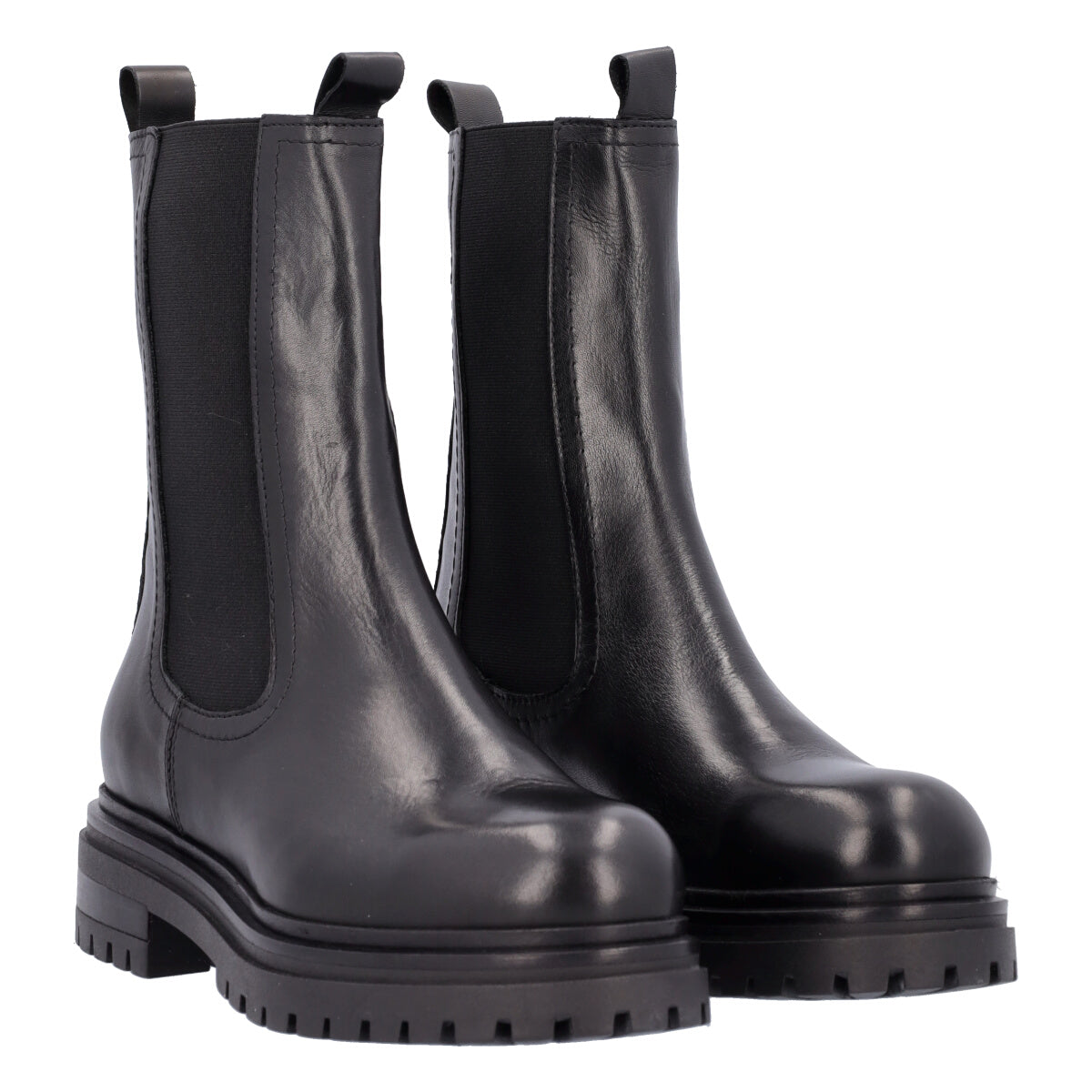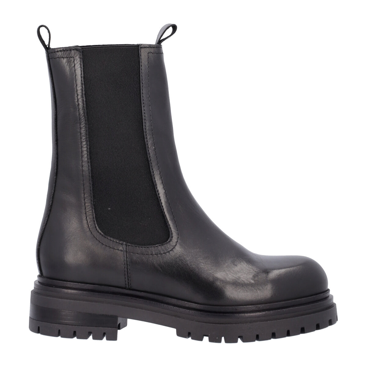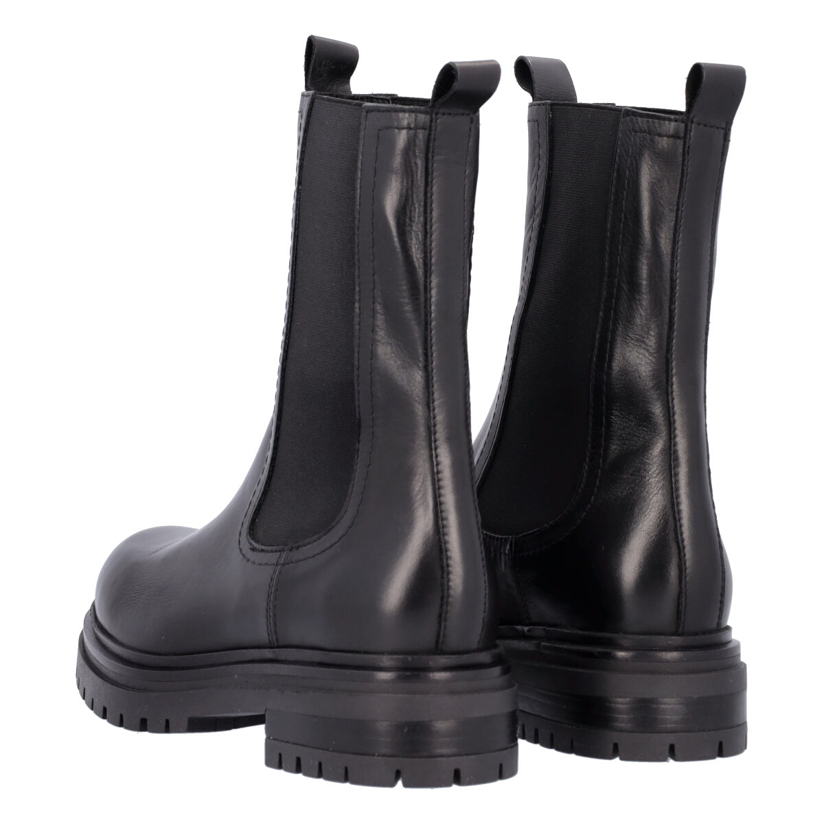 Chelsea Boot nero da donna in morbida pelle con elastici laterali, fodera in pelle liscia e suola carrarmato in gomma.